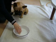 ご飯のおわんを使ってアイコンタクトのトレーニング中に