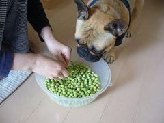 今日は食卓に豆ご飯が登場するのかな・・・? それにしても 大量ですね☆ ワン太郎君も、フードにトッピングしてもらえるんでしょうか?