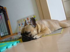 全身の力を抜いて、ずいぶんと平べったい感じに見えます。 ワン太郎君、もうすぐお昼ご飯ですよ。