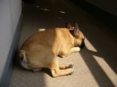 ワン太郎は、よせばいいのにベランダでの日向ぼっこに果敢に挑んでいます。