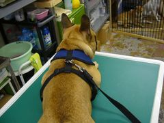 お尻の触診中は、目の前に数匹のワンちゃんたちがいたので、終始ソワソワしていました。