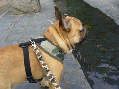 駅前公園の水辺で立ち往生のワン太郎。