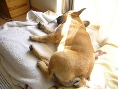 日向でのお昼寝が楽しい季節が到来ということで、ワン太郎は今朝から窓辺で