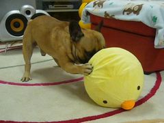 ワン太郎が格闘している相手は、私の正座椅子(ヒヨコ型)