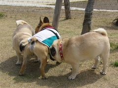 パグコンビに両脇を固められて、緊張気味のワン太郎くんが